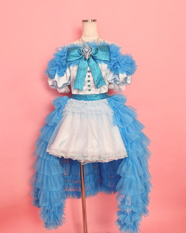 【セット内容】 トップス×1(背中ファスナー) スカート×1(サイドファスナー/後ろゴム) 【サイズ】 ▼トップス バスト:約85cm 着丈:(ブルー)約34cm (ホワイト)背中部分約24cm ▼スカート スカート丈:約39cm ウエスト:約61-69cm(後ろゴム) ※若干の誤差がある場合がございます ※トルソーサイズ:B88cm / W66cm / 91cm 【注意事項】 ・ご使用のディスプレイの環境によって、色味が異なって見える場合がございます。 ・こちらの商品は全てハンドメイドで製作されていますので、お取り扱いはご丁寧にお願い致します。 ・トルソーはパニエを着用しております。
